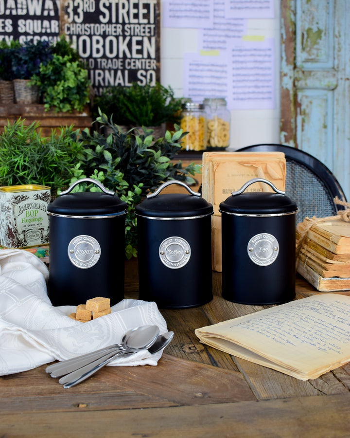 Per una casa in perfetto stile urban o per una cucina giovanile e spiritosa, non potranno di certo mancare questi barattoli in latta neri per tè, zucchero e caffè.