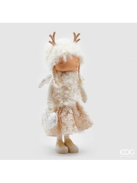 Deliziosa bimba renna con ali d'angelo, con vestitino in pizzo e tanti dettagli raffinati ed eleganti per un pezzo da collezione, romantico e senza tempo.