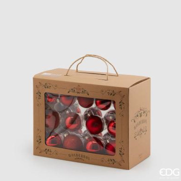 Confezione assortita di palline rosse con diverse varianti di finitura e misura.