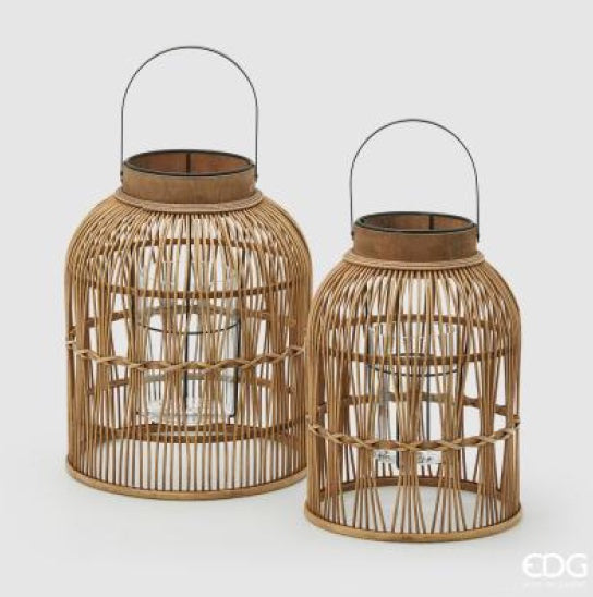 Lanterna in bamboo con manico e struttura porta candela in metallo con vetro.