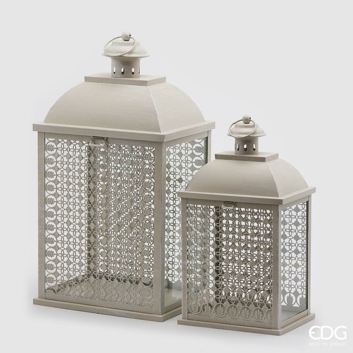 Lanterna in metallo con fantasiosa lavorazione floreale sulla griglia anteriore per creare un'atmosfera magica a lume di candela. Disponibile in due misure.