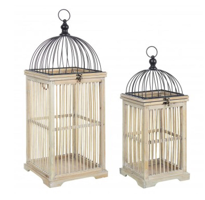 Lanterna in legno con gabbia superiore in metallo.