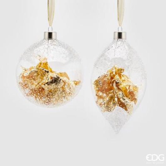 Elegantissima pallina di vetro trasparente con lavorazione in rilievo e con nastrino che contiene delle foglie oro al suo interno per dare un tocco di luce e impreziosire il vostro albero di Natale. Disponibile nella variante tonda o allungata.