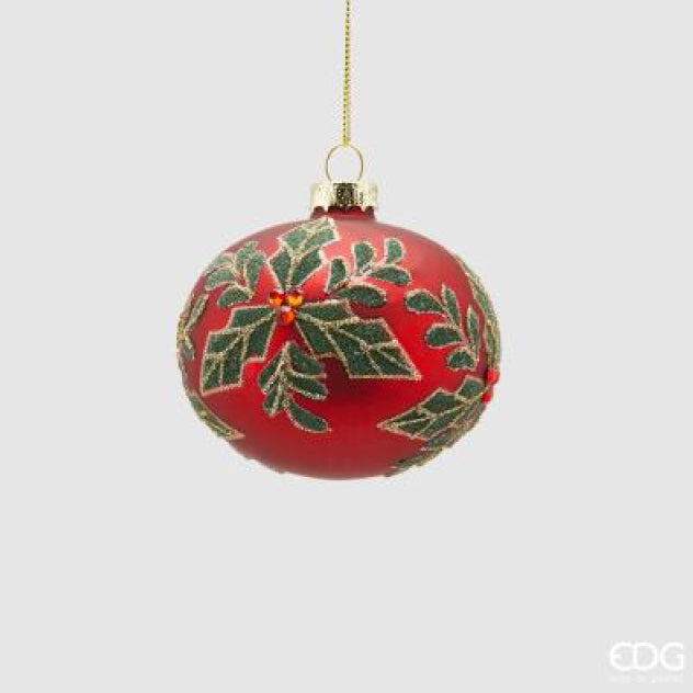 Elegantissima e raffinata pallina rossa con decoro agrifoglio impreziosita dalla luce delle gemme.