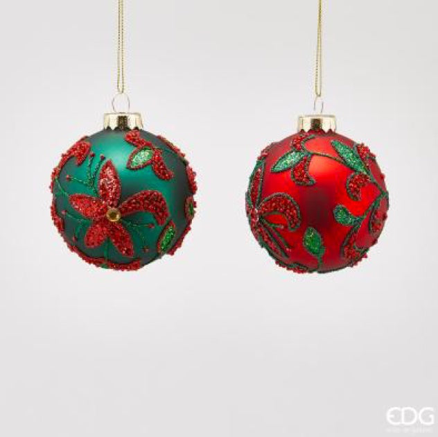 Bellissima pallina decorata con decoro di foglie e bacche, perfetta per un albero tradizionale, ricco e luminoso, dove i riflessi delle luci con le paillettes creano dei meravigliosi giochi di luce. Disponibile in due misure e in due varianti di colore.