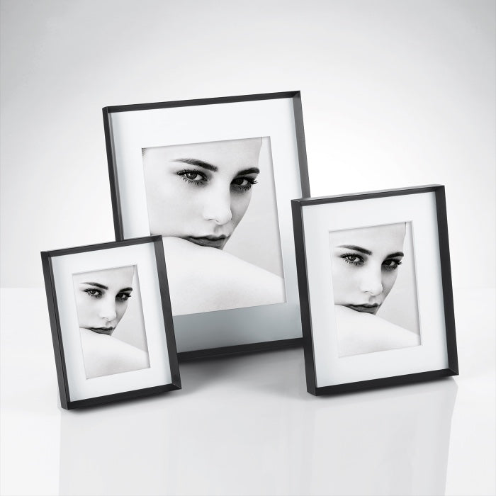 Portafoto da tavolo e da parete in alluminio estruso con passepartout in cartoncino.