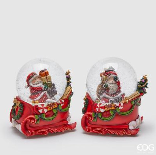 Bellissima sfera acqua musicale a forma di slitta con Babbo Natale pronto a distribuire i regali.