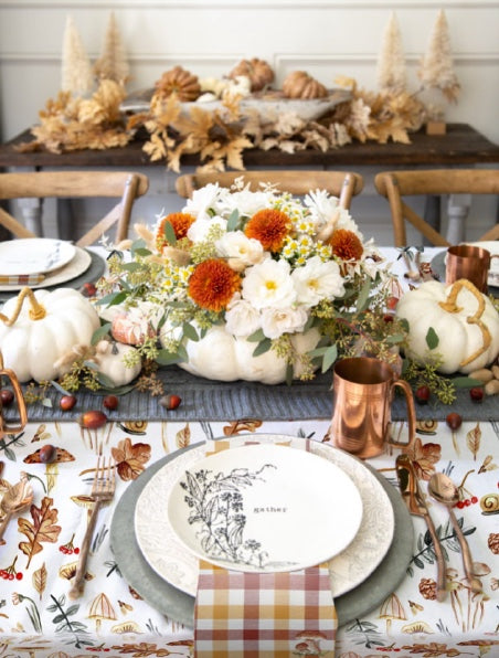 Tovaglia in cotone con stampa digitale e trattamento antimacchia non resinato.