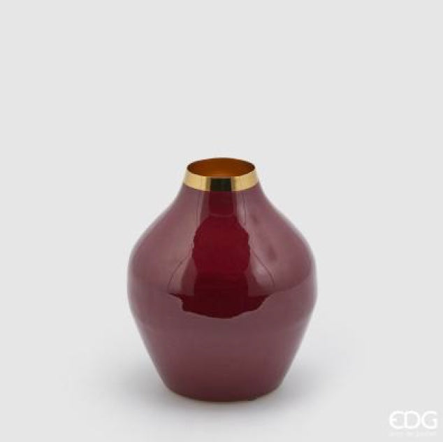 Elegante vaso in metallo smaltato in una finitura bordeaux, impreziosito da un bordo dorato.