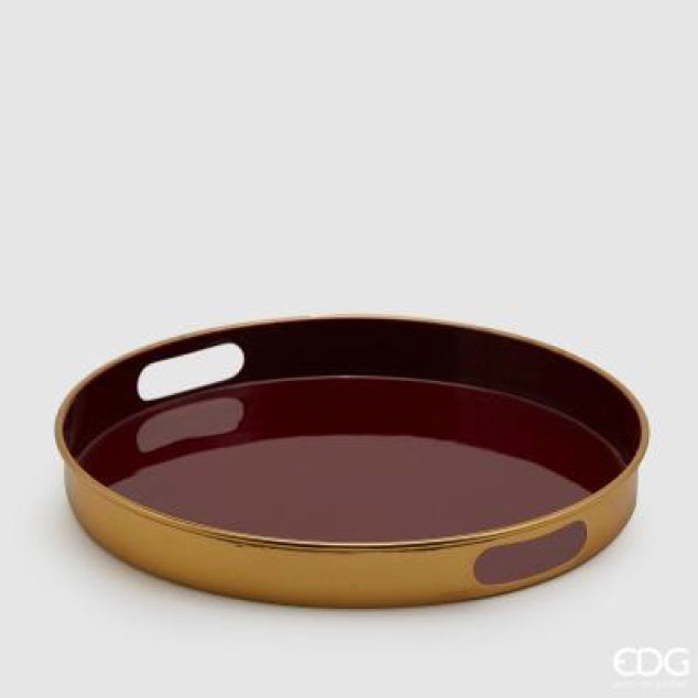 Elegante vassoio in metallo smaltato in una finitura bordeaux, impreziosito da un bordo dorato.