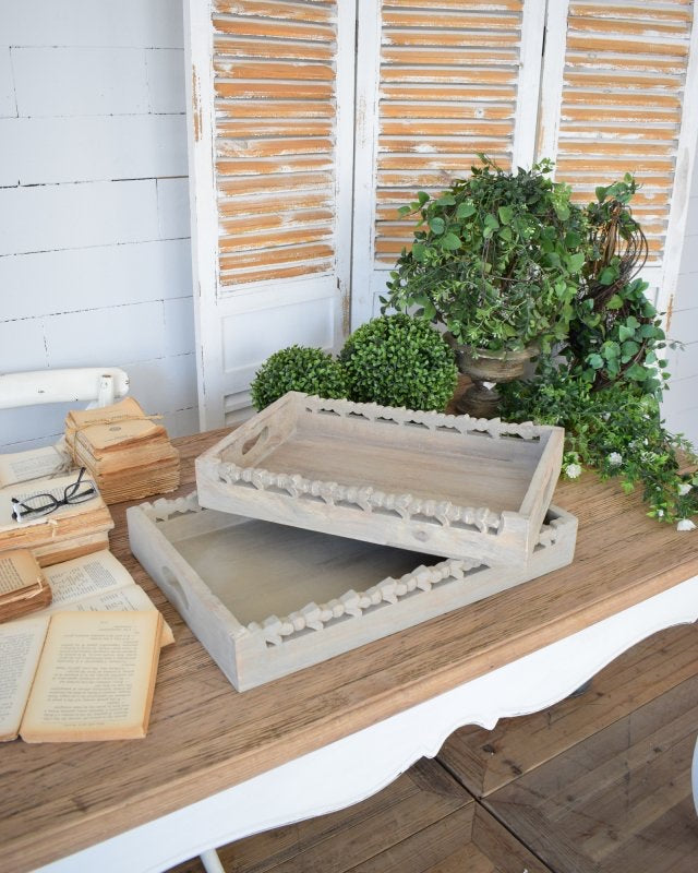 Vassoio in legno con bordi artigianalmente intagliati e un'elegante finitura grigia che lo rende elegante e sofisticato, adatto a diversi stili di arredo. Sarà perfetto per servire il caffè o l'aperitivo ai vostri ospiti.